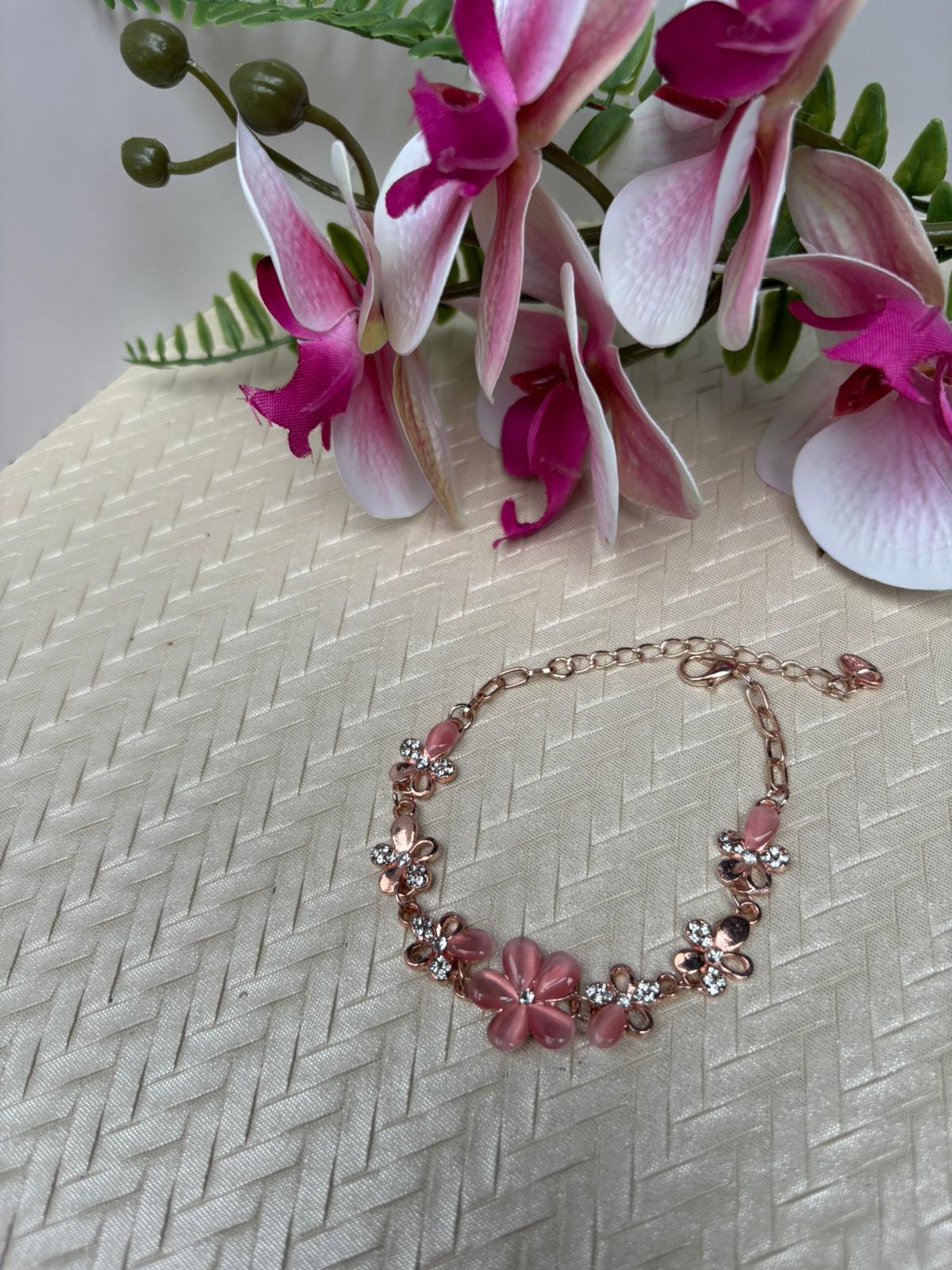 Lass dein Handgelenk erblühen mit unserem funkelnden 18K Rosegold überzogenen Armband! Die schimmernden Opal-Blumen tanzen im Licht und versprühen magische Reflexe bei jeder Bewegung. Schick genug für besondere Anlässe, aber zu hübsch, um es im Schmuckkästchen zu verstecken – trag diesen modernen Blickfang täglich und sammle Komplimente wie Blütenblätter! Dein neues Lieblingsstück mit verspieltem Charme!