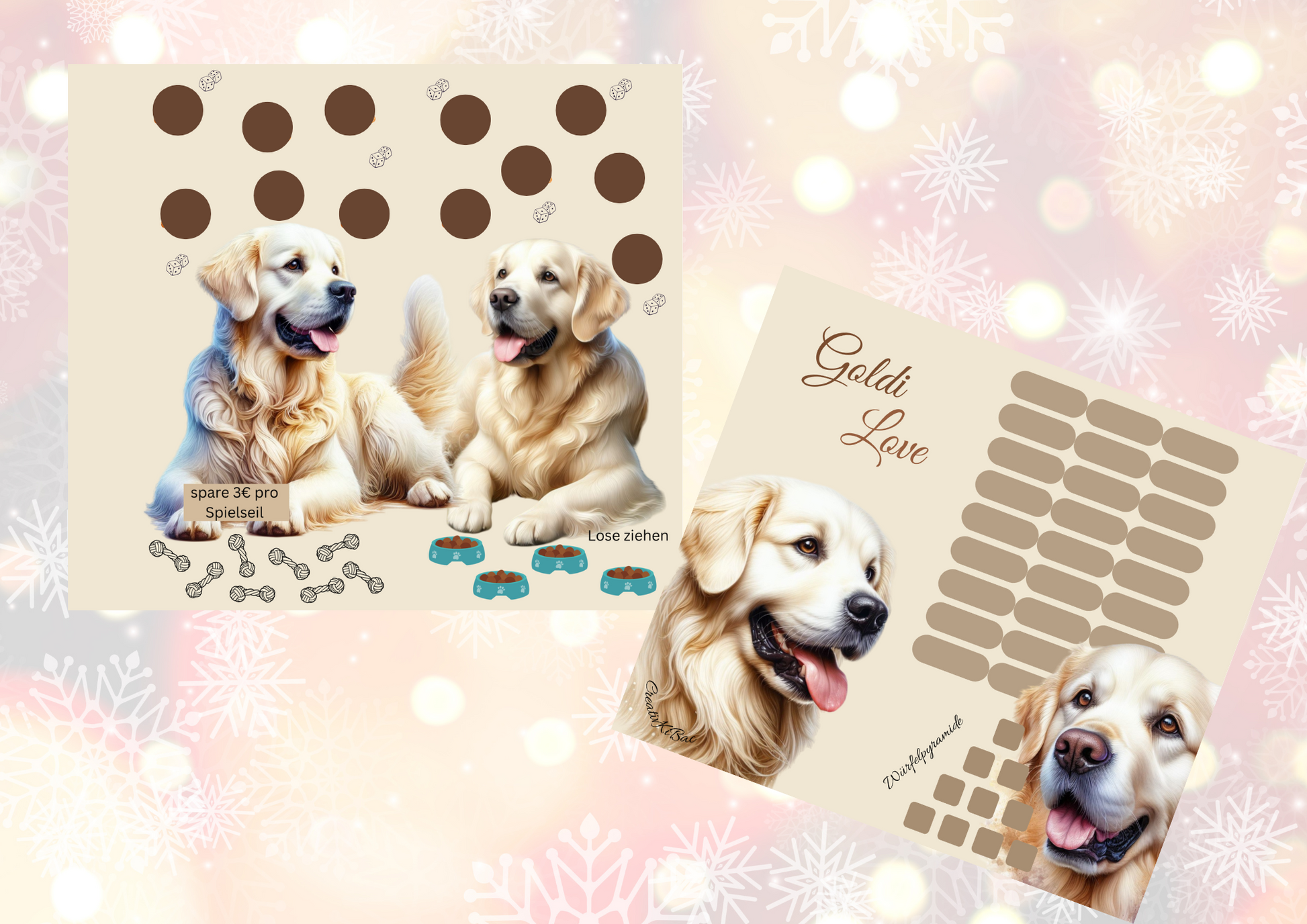 Wuff, wuff! Unsere "Goldi Love" Klappkarten sind da! Mit zuckersüßen Golden Retriever-Motiven verziert und praktisch gelocht. Rubbel um die Wette, zieh spannende Lose oder spare pro Seil! Würfel und streiche ab für extra Spaßfaktor. Das Beste? Du erfüllst dabei einen Herzenswunsch deines pelzigen Freundes! Diese verspielten Karten bringen Hundeliebhaber zum Schwanzwedeln vor Freude. Goldi Love – wo Sparen und Hundewünsche wahr werden!