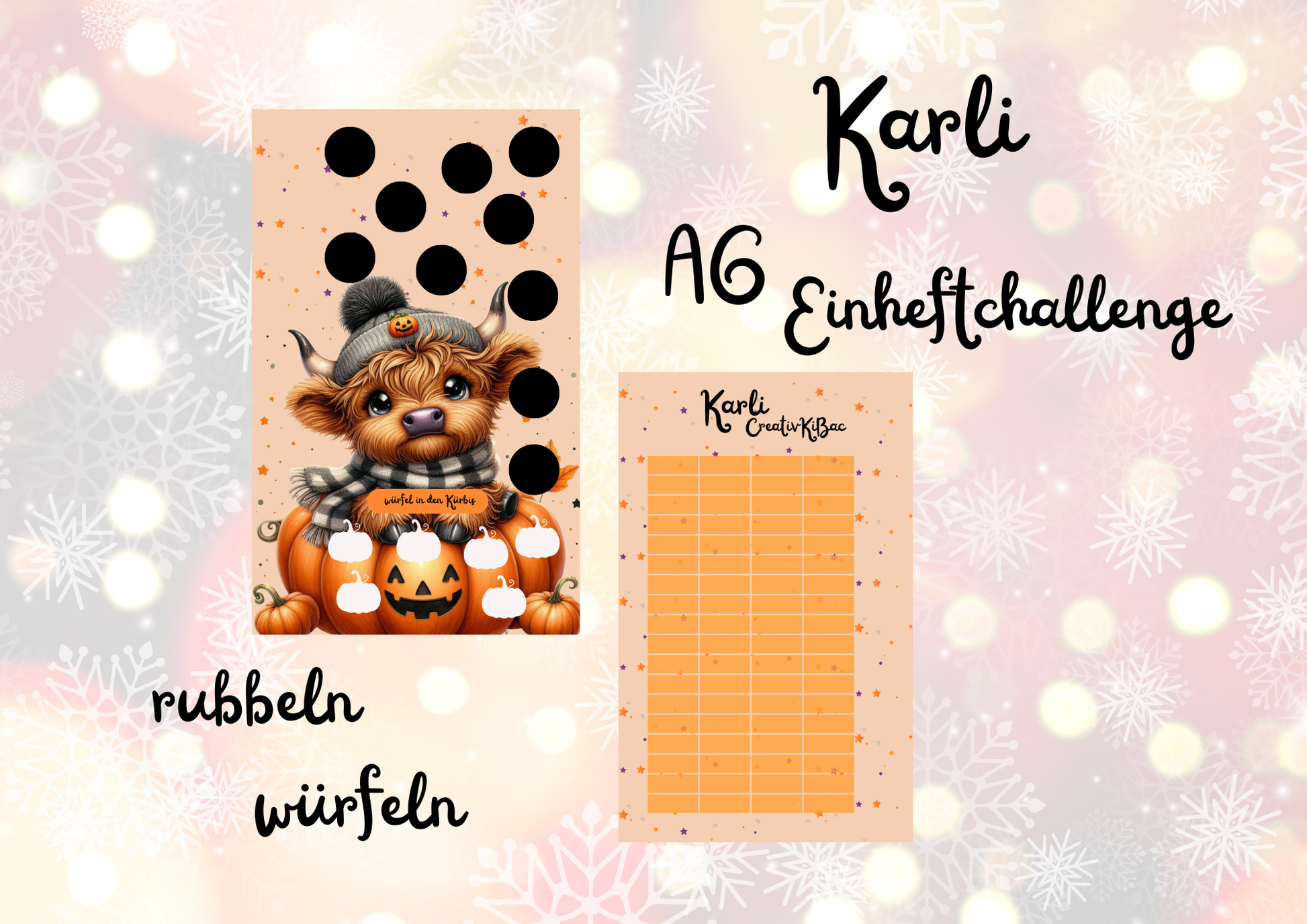 Der süße Karli ist eine A6 Einheftchallenge und hier könnt ihr durch rubbeln und würfeln mit Freude sparen.