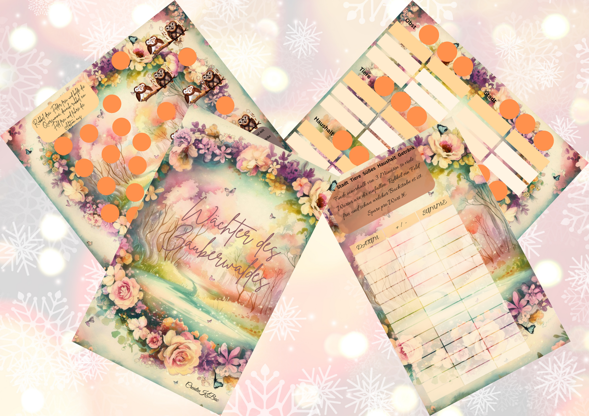 Taucht ein in "Wächter des Zauberwaldes" – alleine oder als spannendes Battle mit einer anderen Sparverrückten! Rubbelt 3 magische Felder frei und spart die Quersumme plus ein Zusatzfeld, streicht Eulen mit einem 4er-Würfelwurf ab oder entdeckt versteckte Wörter durch freigerubbelte Buchstaben. Dieses gelochte Abenteuer kommt mit Deckblatt und einer hilfreichen Erklärung auf der Rückseite. Lasst den Zauberwald euch beim Sparen helfen!