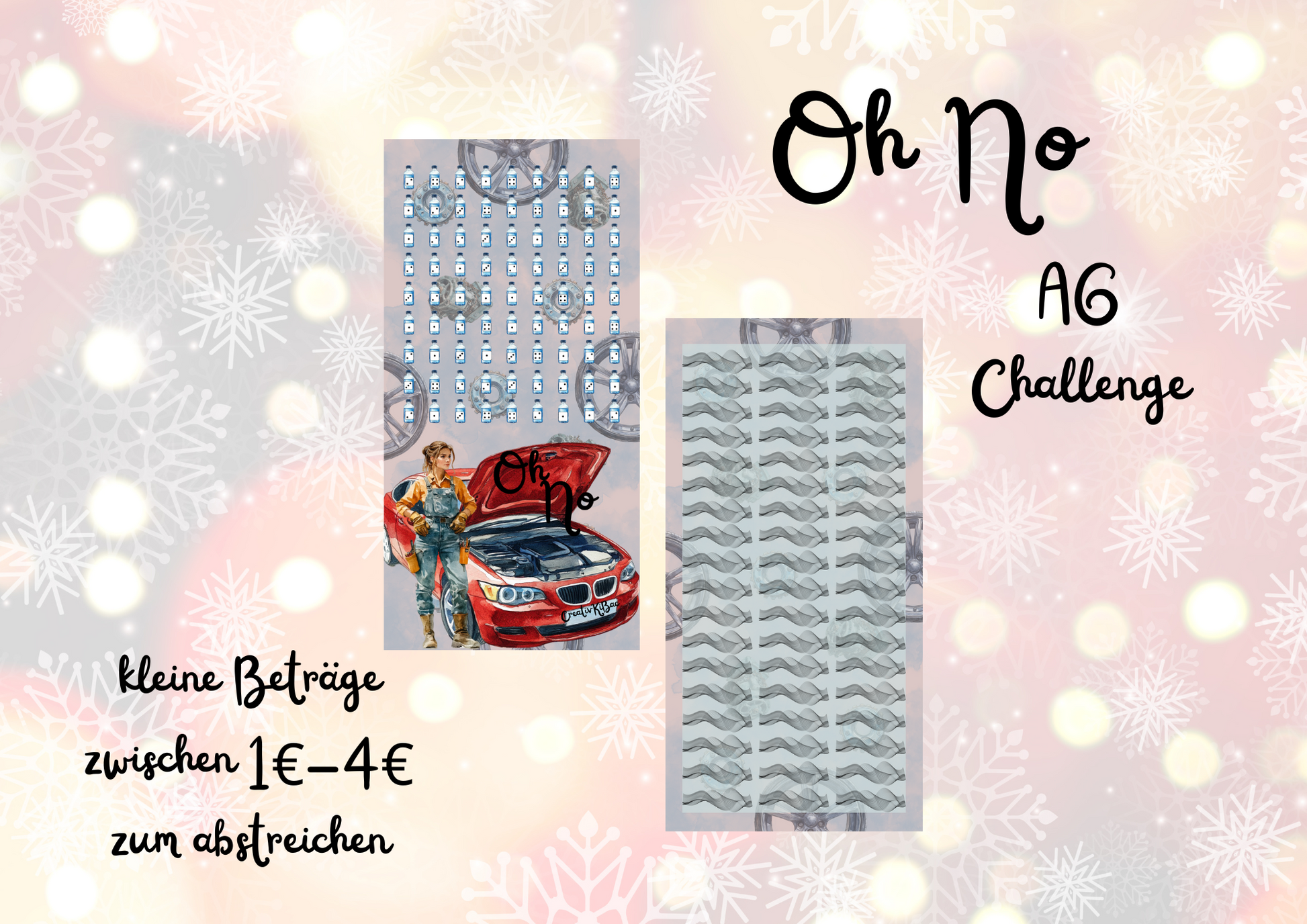 Die A6 Challenge „Oh No“ ist der ideale Begleiter zu den anderen Reparaturchallenges rund ums Auto. Mit Sparbeträgen zwischen 1€ und 4€ wächst dein Reparaturfonds ganz entspannt – so kommt schnell ein hübsches Sümmchen zusammen, ohne dass es weh tut!
