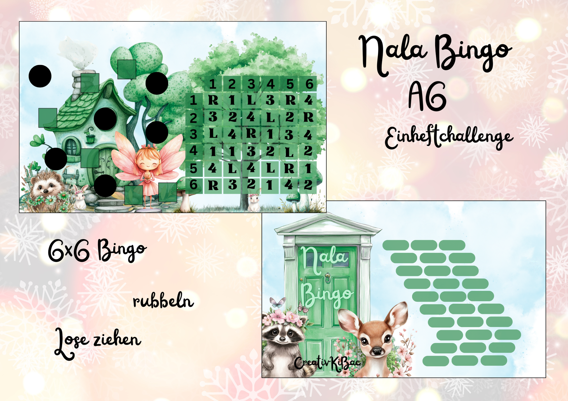 Ein kleines 6x6 Bingo mit Aktionen wie Lose ziehen und rubbeln. Die Challenge ist gelocht und zum Einheften.