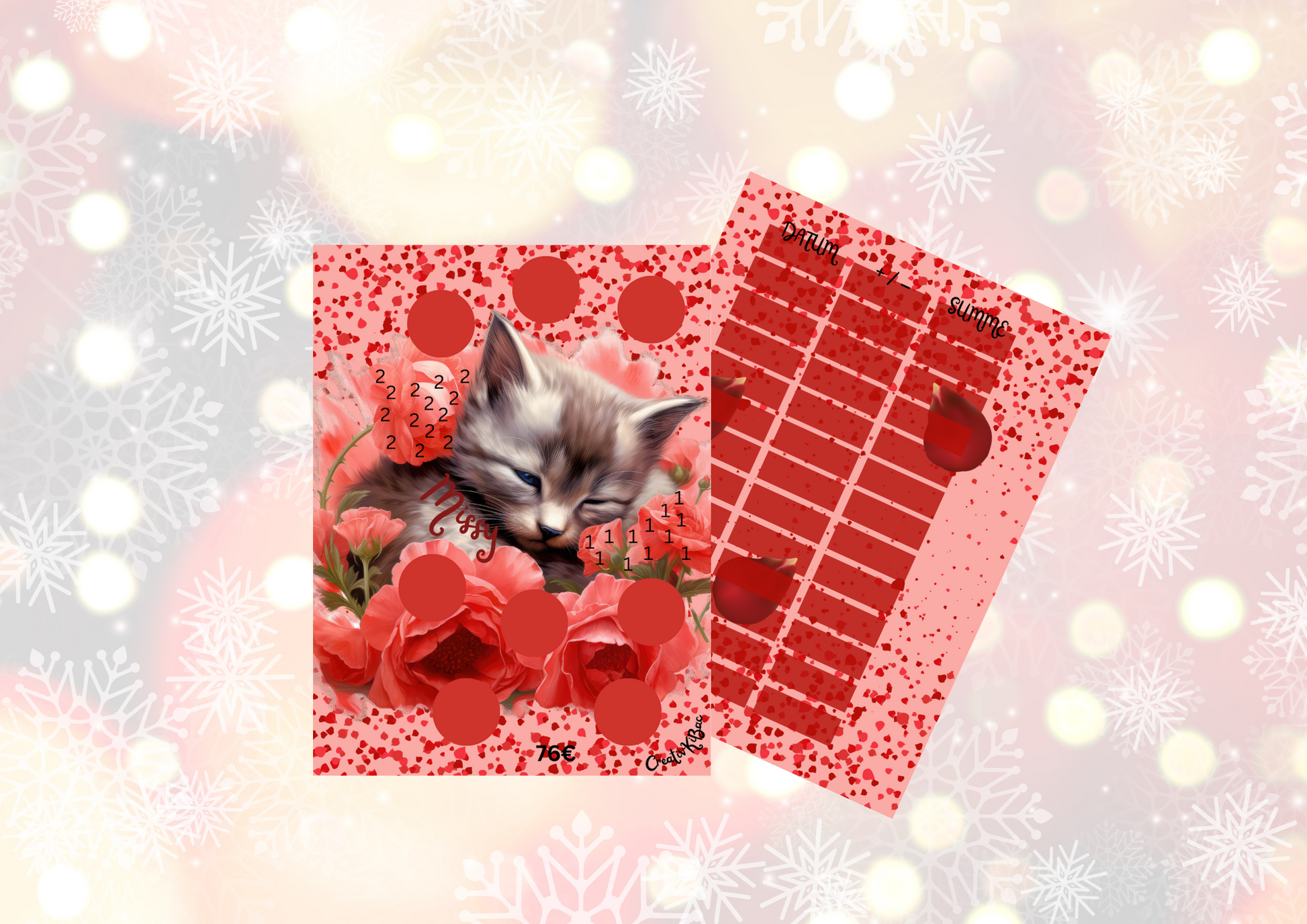 Entdecke "Missy" - unser bezauberndes Rubbelsparheft mit niedlichem Katzenbaby-Motiv auf Blüten! In leuchtendem Rot und praktisch gelocht, lässt es dich Beträge frei rubbeln und abstreichen. Perfekt für kleine Sparziele in zwei handlichen Größen: A6 und A7. Ein verspielter Begleiter für deine Sparmomente!