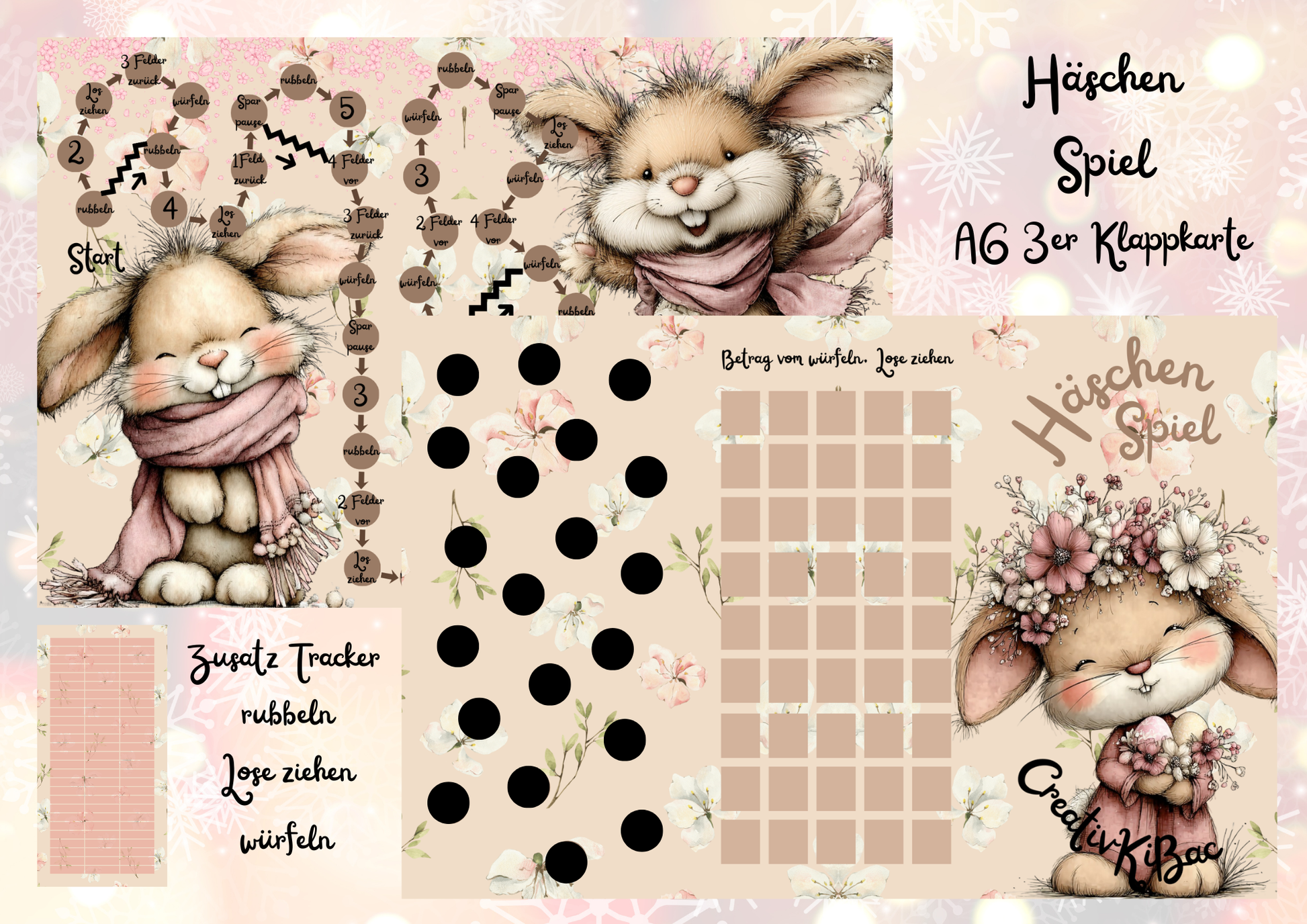 Das Häschen Spiel ist im A6 Format und eine 3er Klappkarte, passend für Hüllen in A6 Format.