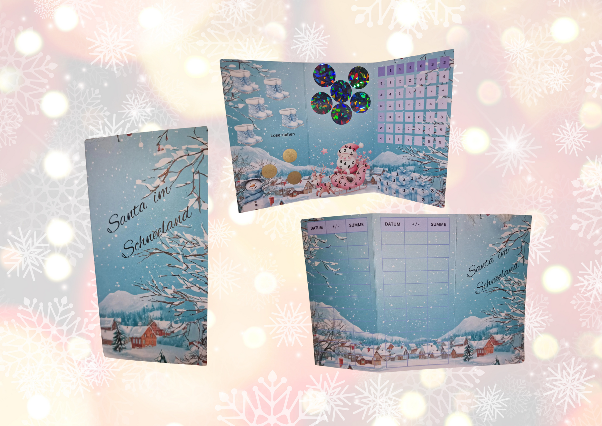Santa im Schneeland ist eine 3er Klappkarte. Beim Zahlenbingo muss man nicht nur abstreichen sondern auch rechnen wenn man auf das passende Feld kommt. Aber auch rubbeln, abstreichen und Lose ziehen kommen nicht zu kurz.