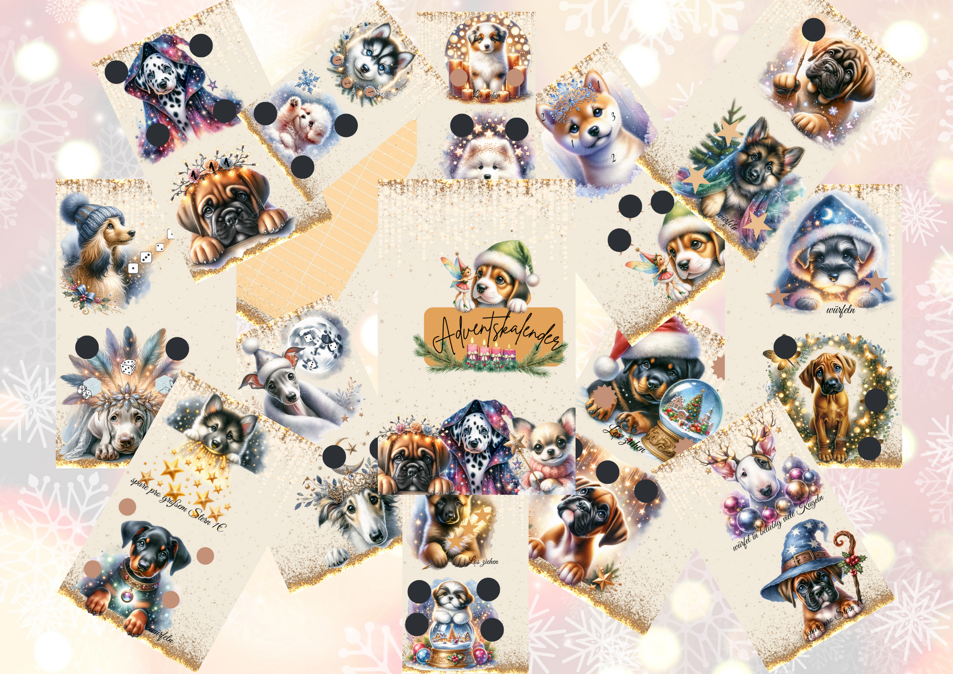 Erlebt die Vorfreude auf Weihnachten mit 24 süßen Hundewelpen, die euch jeden Tag auf neue Weise verzaubern – ob durch Rubbeln, Abstreichen, Würfeln oder Losziehen. Der beidseitig bedruckte Adventskalender auf 6 Seiten bietet jeden Tag ein neues Abenteuer mit je 4 Welpen, einem Deckblatt und einem praktischen Tracker. Perfekt zum Einheften in euren A6-Binder und ideal, um die Tage bis Weihnachten spielerisch zu zählen!