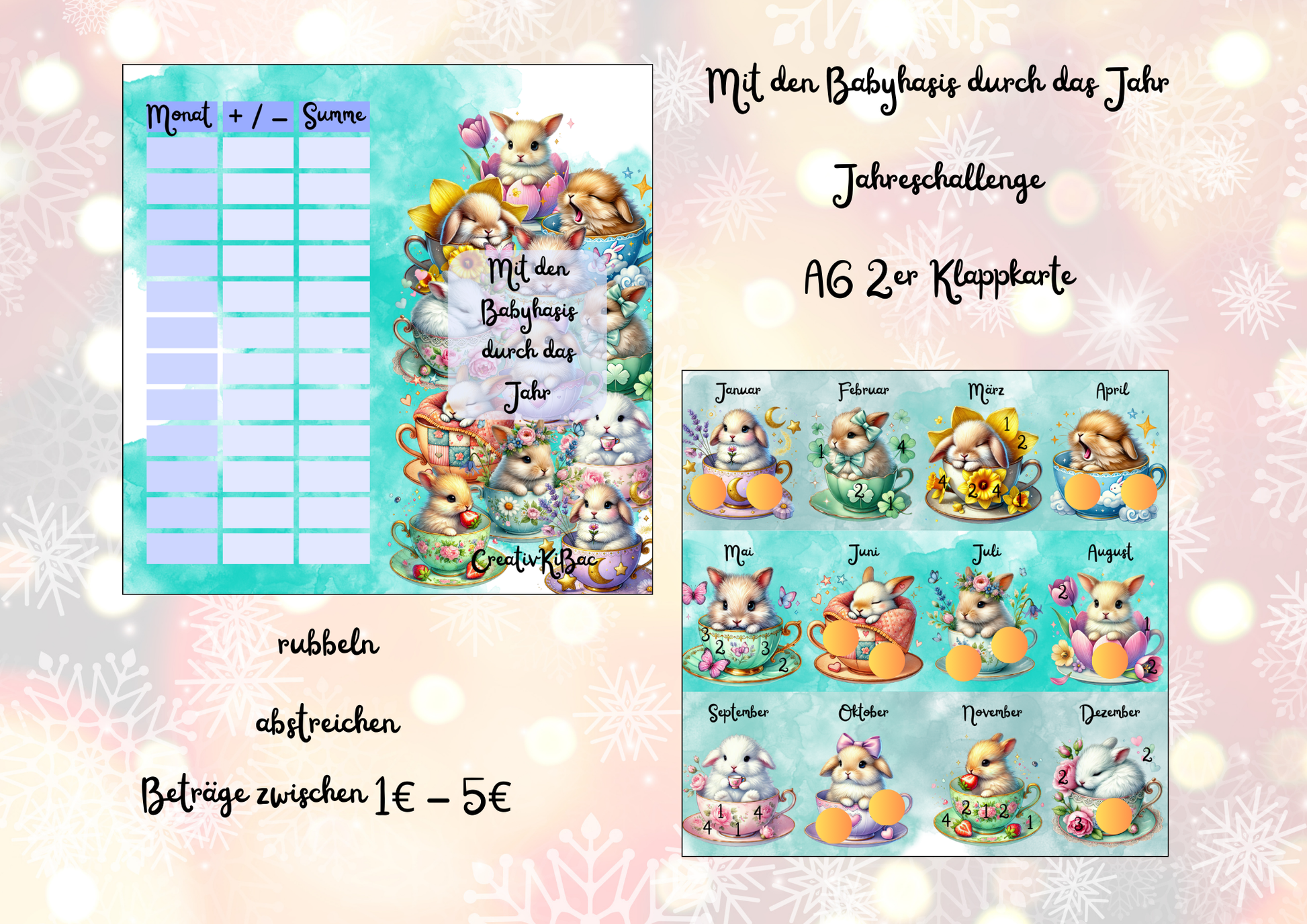 Von Januar bis Dezember begleiten dich die süßen Hasenbabys durch das ganze Jahr! Mit kleinen Beträgen zwischen 1€ und 5€ sparst du ganz entspannt. Rubbeln oder Abstreichen bringt dich in kleinen Schritten deinem Ziel näher – alles verpackt in einer liebevollen A6 2er Klappkarte, die Spaß macht und motiviert.
